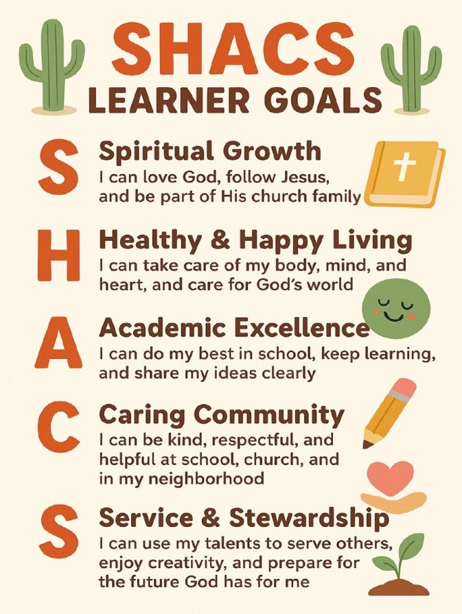 Saguaro Hills Adventist Christian School follows a standard based curriculum. Students work in a multi-grade environment. For example, TK-1st, 2-4th, and 5-8th grades are grouped together. Subjects such as Bible, Art, Science, Social Studies and PE are taught as whole group in each class. Each grade level or student levels are grouped on a skill based performance in Math and Language Arts. To see what standards are taught at each grade level please see the North American Division of Seventh-day Adventist Education page for Standards.